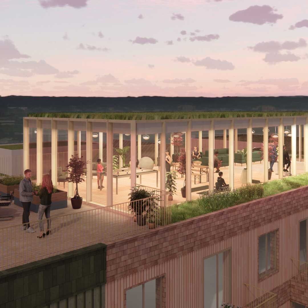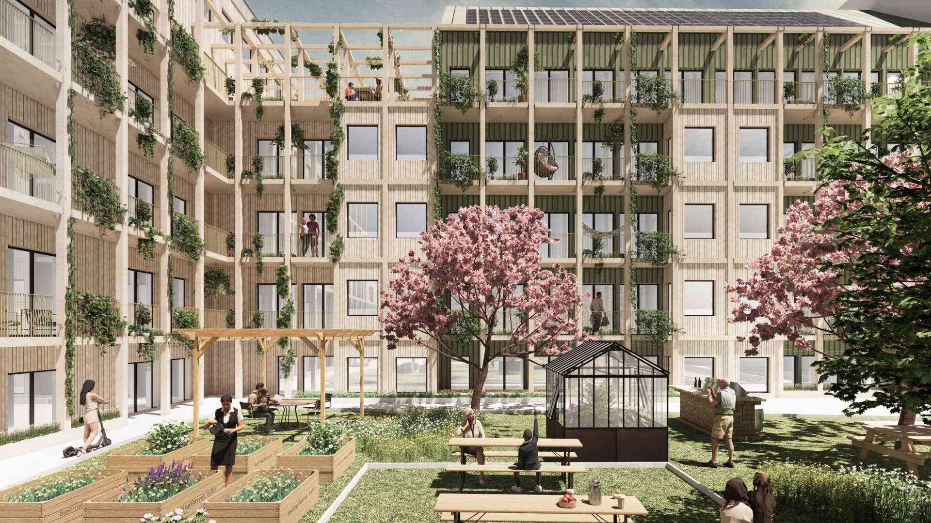 Högt ovan torget finns ett vidsträckt taklandsskap av terrasser, odlingar och växthus där de boende umgås – liksom ett stort, glasat orangeri. Här uppe finns också mängder av solceller som genererar el till kvarterets drygt 150 lägenheter. På gården leker barn vid dagvattendammen, seniorer spelar boule under träden, studenter kör rundpingis, familjer grillar och gröna fingrar pysslar i växthus och komposter. En storfamiljsidé som är möjlig tack vare att kvarteret innehåller såväl stadsradhus och stora familjelägenheter som ettor och Bonumlägenheter.