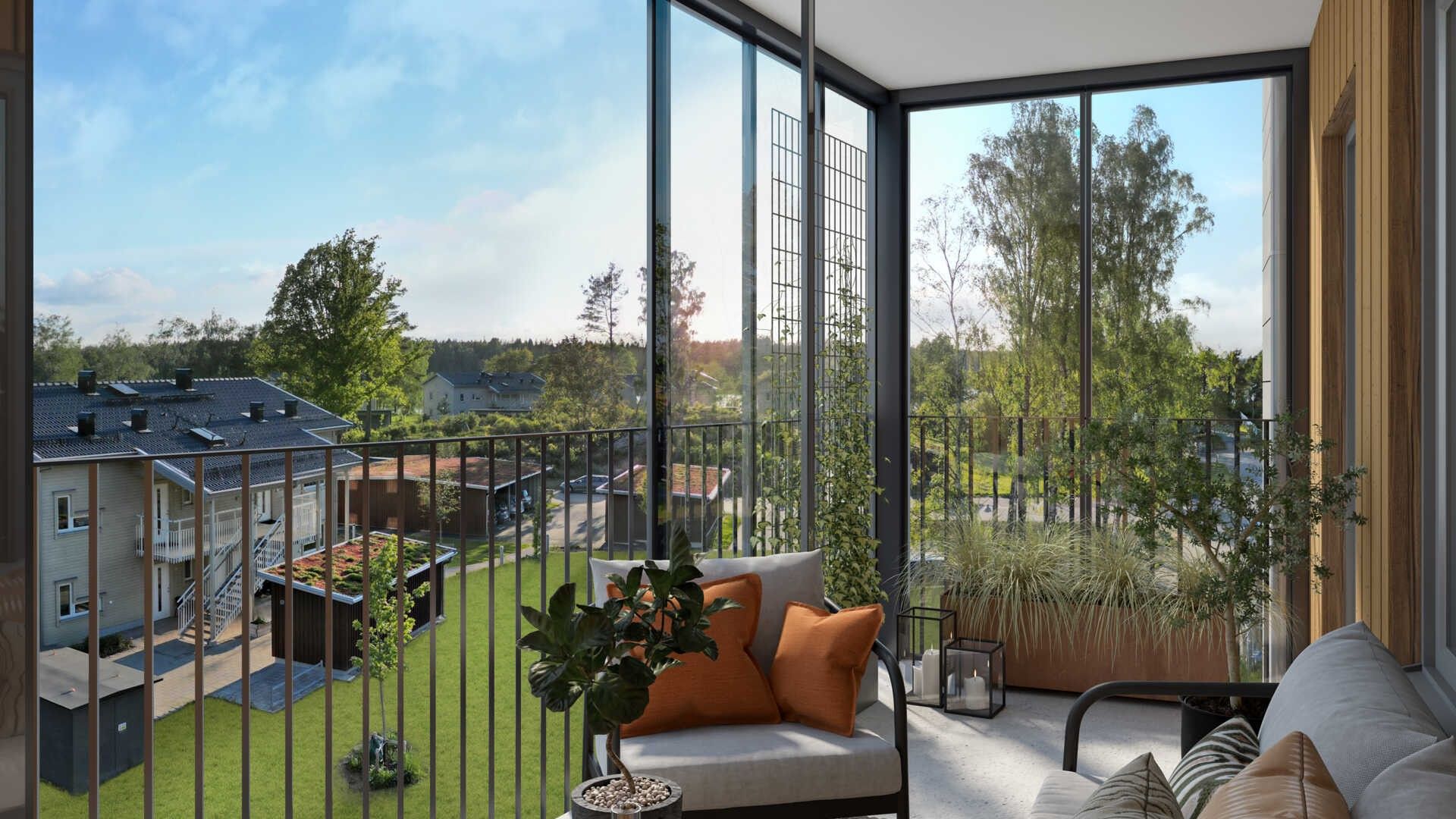 Det nya flerbostadshuset blir fem våningar högt och fylls med yteffektiva lägenheter i olika storlekar och planlösningar. Alla har en inglasad öppningsbar balkong eller uteplats mot kvällssolen i väster.