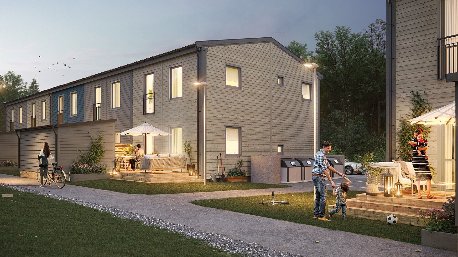 I första etappen släpps endast 10 bostäder, så passa på att säkra ditt nya hem i tid. Radhusen byggs i trä med en färgsättning som smälter in i den omgivande naturen. Varje bostad har en privat uteplats i västerläge – perfekt för att njuta av både morgonsol och kvällssol.