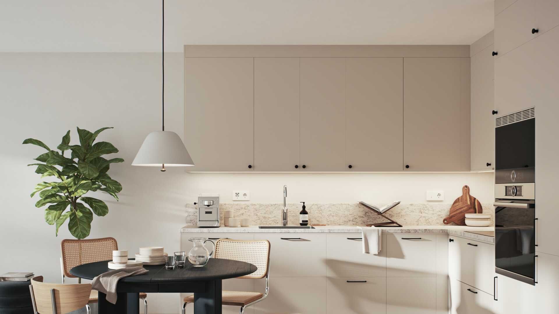 Varje våning i huset har sin egen unika färgsättning. Vi erbjuder fyra olika inredningskoncept; harmonisk linnebeige, sofistikerat betonggrått, klassiskt vitt samt valnöt/vitt-kombinationen för rooftop lägenheterna. Varje våningsplan har sin karaktäristiska färgidentitet som skapar en personlig känsla i varje hem.